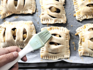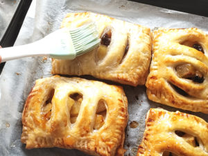 ![]() 17:天板にクッキングシートを敷き、少し間隔を空けて、パイを並べます。 18:残りの生地も成形を終えたら、天板の上に並べ、溶き卵を表面に塗りましょう。 |