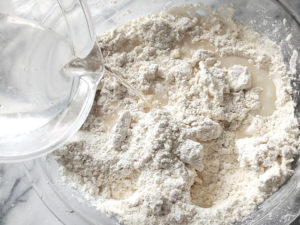 ![]() 2:冷水をボールにまず半量加えて手でこね、数回に分けて水を加えながら捏ねて、まとまったら、強力粉を少量(分量外)振った台の上に出しましょう。 |