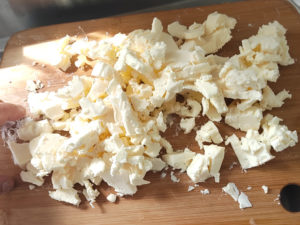 ![]() 4:冷凍の無塩バターを取り出し、包丁などで細かく刻みます。 (冷凍のバターなら、おろし金でもすりおろせますが、今回はカットしました。) |