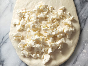 ![]() 5:生地を麺棒で縦長の長方形になるように伸ばし、上1/3を残して刻んだバターを散らしましょう。 6:上1/3の生地を下に折り返すようにして、バターの上にかぶせます。 |