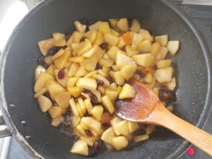 ![]() 10:フライパンにりんご、上白糖、フィリング用の有塩マーガリン、ドライレーズン、刻んだアプリコット(あれば)、レモン汁を加えて火にかけます。 |