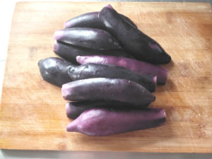 1:ナスはヘタを取って、縦に2等分したら、皮目に浅く斜め格子の切れ目を入れておきます。
