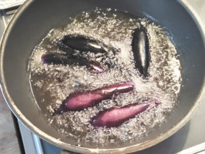 2:フライパンに多めに揚げ油(分量外)を用意し、茄子の両面が色よくなり、箸で触ると柔らかくなるまで揚げましょう。