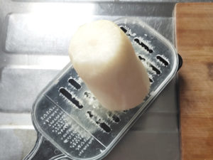 3:ナスを揚げている間に、大根の皮をむき、おろし金ですりおろしておきます。