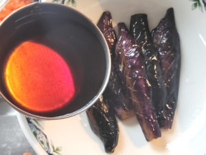 5:耐熱容器に揚げナスを入れ、水とめんつゆを混ぜたものをかけます。