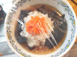6:ナスの上に大根と人参のおろしを乗せたら、ラップをして、レンジで3分ほど加熱しましょう。