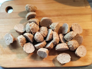 ![]() 1:冷凍肉団子は解凍しておき、縦半分に切ります。 |
