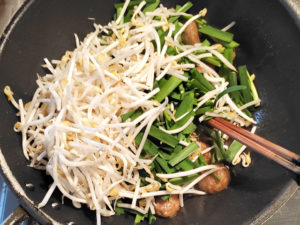 ![]() 5:今度はフライパンを強火にかけ、もやしとニラを投入して炒めます。 6:1分~2分炒めて、ニラがしんなりすればOK。 |