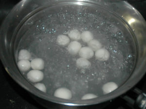 2:お湯を沸かし、白玉をゆでて、上に浮いてきたら、更に1分ほどゆでましょう。