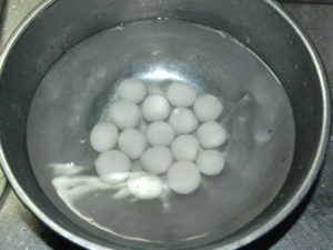 3:ゆであがった白玉を、水に入れて冷やし、5分経ったら、水気を切っておきます。