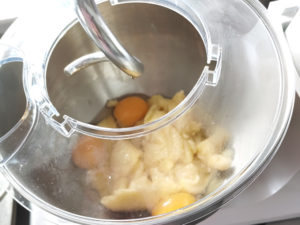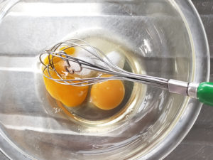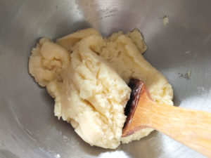 ![]() 12:生地の温度が人肌になったら、スタンドミキサーにドゥーフックを装着し、卵を2個入れて、一番遅いスピードで混ぜましょう。 13:生地がなめらかになったら、溶き卵を少しずつ加えて、へらで混ぜます。 |