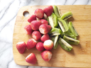 ![]() 20:生地が焼けたら、しっかりと冷まして置きます。 21:その間に、苺はヘタを取り、キウイは皮をむいて、4等分のくし形に切りましょう。 |