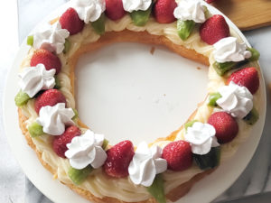 ![]() 26:18cmのシュー生地も乗せ、上にホイップクリームを絞ったら、半分にカットした苺を、クリーム1個ずつの間隔を空けて並べましょう。 |