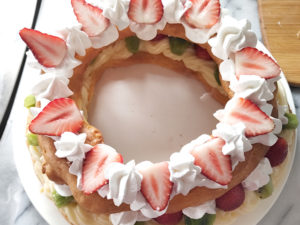 ![]() 27:最後にカットしておいた大きい方の生地で蓋をし、その上にホイップクリームを等間隔に絞り、余った苺とシュー生地でデコレーションします。 28:完成です。 |