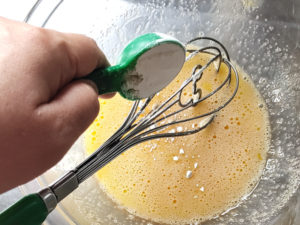 ![]() 1:カスタードの卵を耐熱ボールに入れ、よく混ぜたら、カスタードの砂糖を大1ずつ加え、その都度良く混ぜます。 |