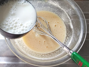 ![]() 3:カスタードの牛乳も少しずつ加え、よく混ぜます。 |
