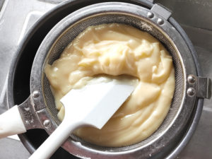 ![]() 6:一旦カスタードクリームをこしてから、ボールに入れ、ラップをぴったりと貼り付けて、使うまで冷蔵庫で冷やしておきましょう。 |