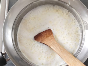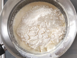 ![]() 9:沸騰してきて、泡が白くなったら火を止めます。 10:間髪いれずに、生地用の薄力粉を一度に加え、手早く木べらで混ぜましょう。 |