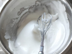 ![]() 11:卵白に残りの砂糖を一つまみ加えて泡立て始め、途中二回に分けて砂糖を加え、ピンと角が立つまで泡だててメレンゲを作りましょう。 |