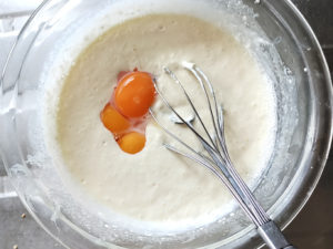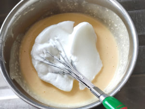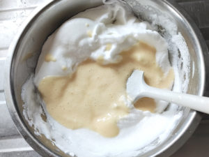 ![]() 12:冷蔵庫から生地を取り出し、メレンゲの半量を加えて、泡立て器でよく混ぜます。 |