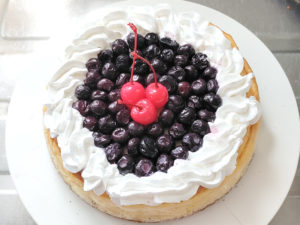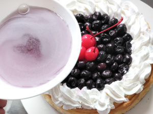 ![]() 20:ケーキが冷めたのを確認してから、上面にまず円周上にホイップを絞り、中央を少し残して、ブルーベリーを敷き詰めます。 21:中央にさくらんぼを飾りましょう。 |