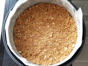 ![]() 4:ケーキ型の側面にクッキングシートを貼り付け、底にビスケットを手のひらで押しながら、平らにならします。 5:一回り大きめ(24cmのデコケーキ型)の上に置き、冷蔵庫で使うまで冷ましておきましょう。 |