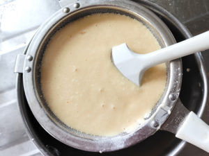 ![]() 8:生地を裏ごしして、粒を取り除きます。 |