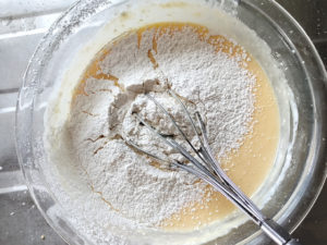 ![]() 9:チーズ生地に、薄力粉とコーンスターチをふるい入れ、泡立て器でよく混ぜ合わせましょう。 |