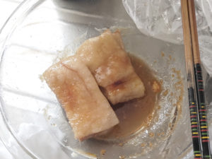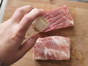 ![]() 1:豚肉は耐熱ボールに入る大きさ(今回は長さを二等分)にカットし、表面にフォークで穴をあけ、味がしみ込みやすくします。 |