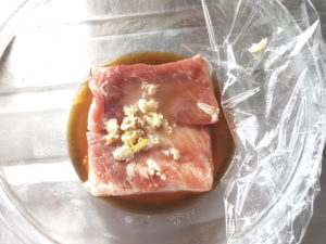 ![]() 3:耐熱ボールに入れた豚肉に、にんにくのすりおろし、酒、砂糖、醤油、みりんを加え、手でよく味をもみ込みます。 |