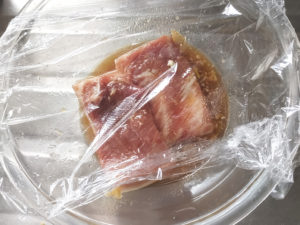![]() 2:豚肉に軽く味塩コショウし、耐熱ボールに入れて、ラップをかけて乾かさないようにしながら、1時間半室温で放置しましょう。 |