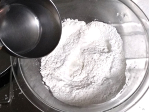 ![]() ②水を少しずつ加え、手で良く練りながら、耳たぶくらいの固さになるまで練り混ぜましょう。 |