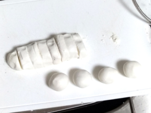![]() ④丸めた生地を棒状にまとめなおし、12等分して、それぞれ団子状に丸めましょう。 |