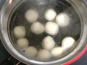 ![]() ⑤小鍋にお湯を沸かし、団子を投入し、団子が浮いてきたら、5分程ゆでます。 |