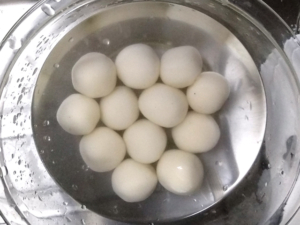 ![]() ⑥団子はすぐに冷水に取り、冷まします。 ⑦竹串は、水に漬けておくと刺しやすくなります。 |