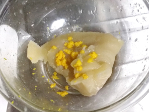 ![]() ⑧耐熱ボールに白あんと、ゆずの皮のすりおろし(1個分)、果汁(1個分)を加えます。 (酸味が苦手な方は、皮だけでもOKです。) ⑨餡子が固い時には、レンジで1分半ほど加熱しましょう。 |