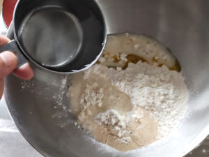 ![]() 1:スタンドミキサーのボールに、強力粉、塩、ドライイースト(塩の反対側に)、オリーブオイル、水の3/4を入れて、ドゥーフックを付けて、低速で捏ねます。 |