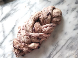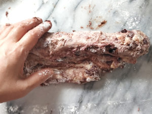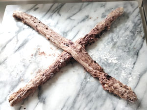 ![]() 8:生地を手でパンチしてガス抜きをしてから、長方形に伸ばし、ロールケーキのようにクルクルと巻いたら、再び手でパンチをして空気を抜いてから、2本の細い棒状にしましょう。 |