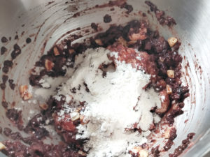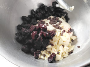 ![]() 3:水気を切ったチェリーとチョコチップ2種を加えてスタンドミキサーにかけます。 |