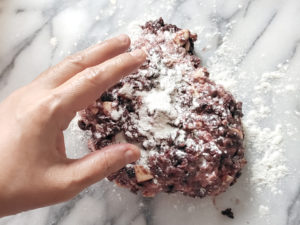 ![]() 5:台の上に、強力粉(分量外)を少し多めに振り、生地を置いたら、さらに分量外の強力粉を振り、手で丸くまとめます。 |