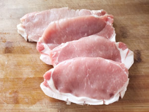 ![]() 1:豚肉は、身と脂身の間に垂直に切り込みを入れます。 (筋きりすると、揚げても縮みにくくなります。) |