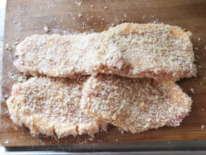![]() 2:豚肉に、薄力粉→溶き卵→パン粉の順に衣をつけましょう。 |