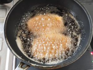 ![]() 3:180度~190度の油で、表面がきつね色になるまで揚げます。 (裏表で、3~4分ずつくらいが目安です。) |