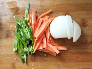![]() 4:玉ねぎは皮をむき薄切りに、人参も皮をむき細めの短冊切りに、ピーマンはヘタと種を取って細切りにしましょう。 |