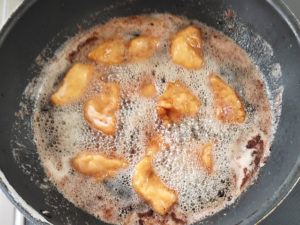 ![]() 6:とんかつを揚げ終わった油を使い、唐揚げは冷凍のまま揚げます。 7:全体が茶色くなったら、唐揚げはOKです。 |