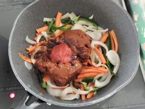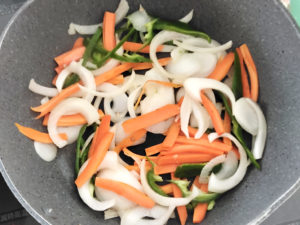 ![]() 8:フライパンに薄く油(分量外)を引き、玉ねぎと人参、ピーマンを炒めましょう。 9:人参がしんなりしたらOKです。 |