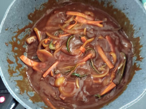 ![]() 10:フライパンに、ドミグラスソース、赤ワイン、ウスターソース、トマトケチャップ、砂糖を加え、ソースが全体に行きわたるまで、加熱しながら火を通します。 |