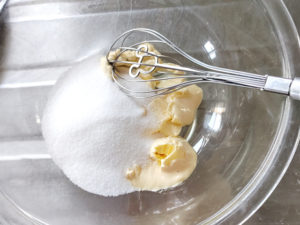 ![]() 1:耐熱ボールにマーガリンを入れて、レンジで20秒ほど加熱し、クリーム状にします。 2:上白糖を加え、ザラザラ感がなくなり、白っぽくふわふわするまでしっかりと混ぜ合わせましょう。 |