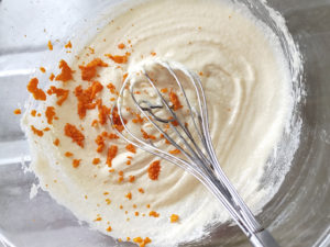 ![]() 3:オレンジの皮をすりおろして加え、よく混ぜます。 ※皮はお湯で洗って、農薬を落としてください。 |