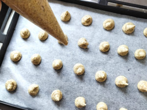 ![]() 6:生地に粉っぽさが無くなったら、絞り袋に詰め、袋の先を少し切って口金代わりにしましょう。 7:天板にクッキングシートを敷き、間隔を空けて小さめに絞ります。 |